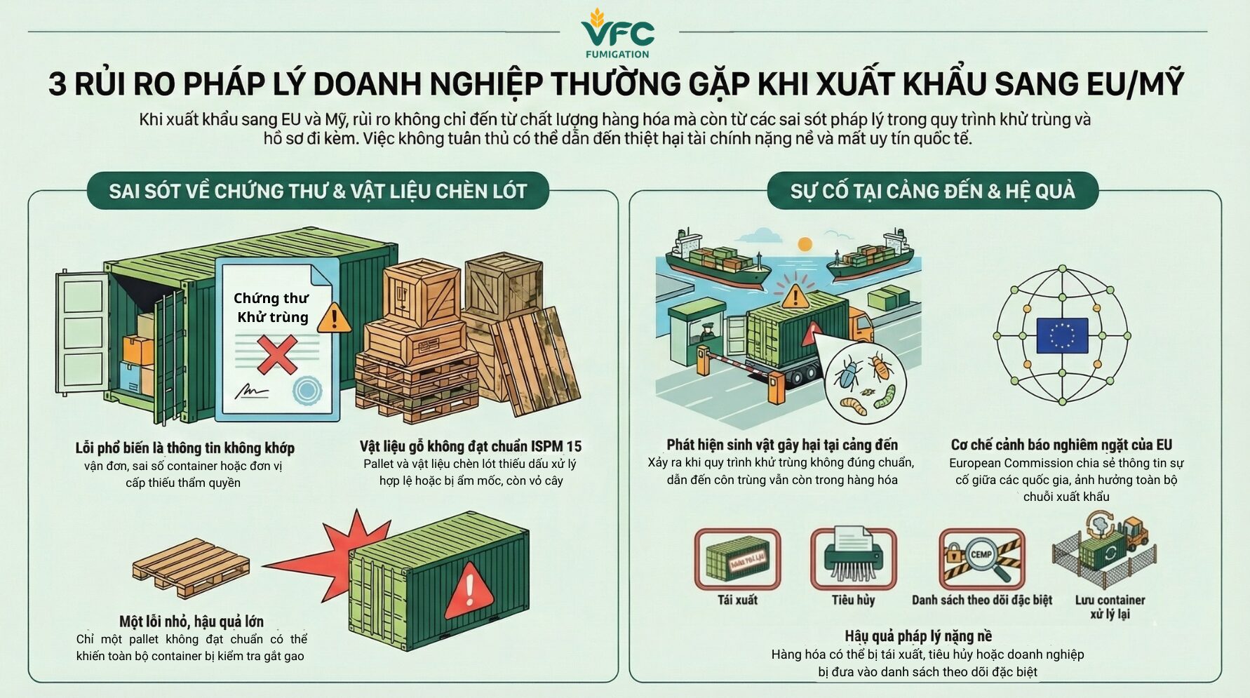 Khi xuất khẩu hàng hóa sang EU hoặc Mỹ, nhiều lô hàng gặp sự cố không phải vì chất lượng sản phẩm mà do sai sót trong hồ sơ pháp lý và quy trình khử trùng. Những lỗi nhỏ trong chứng thư, pallet gỗ hay quy trình xử lý có thể khiến container bị giữ tại cảng, tái xử lý hoặc thậm chí bị từ chối nhập khẩu.